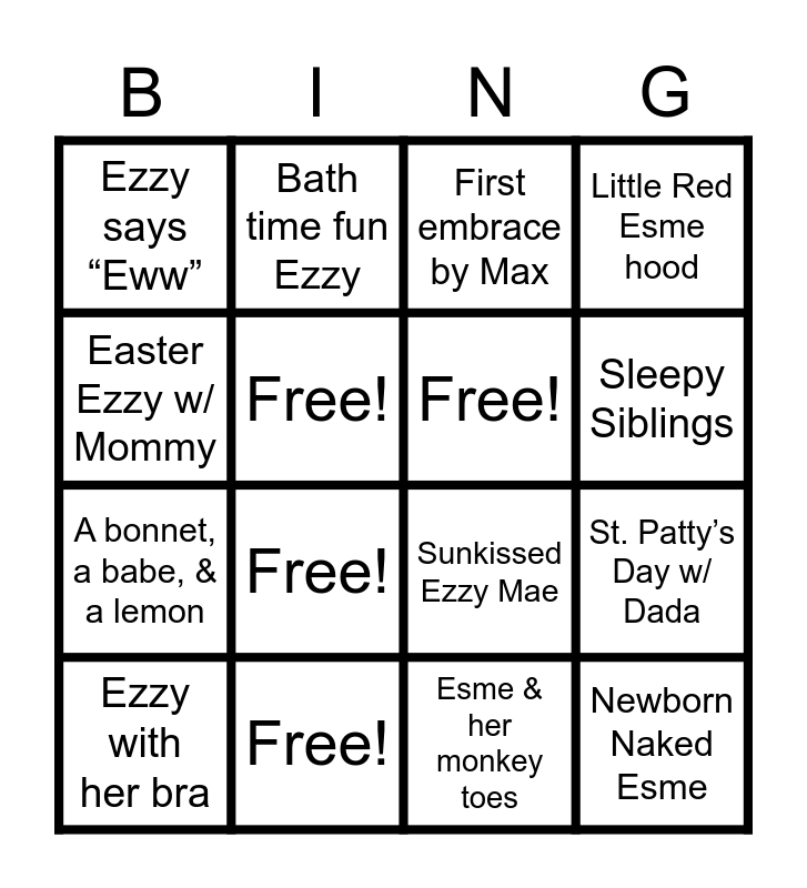 This bingo card has 18 words: Free!, Newborn Naked Esme, First embrace by Max, Ezzy says “Eww”, Sunkissed Ezzy Mae, Little Red Esme hood, Ezzy with her bra, Bath time fun Ezzy, Sleepy Siblings, A bonnet, a babe, & a lemon, Esme & her monkey toes, Easter Ezzy w/ Mommy, St. Patty’s Day w/ Dada, Free!, Free!, Free!, Free! and Mommy, Daddy, Ezzy hands.