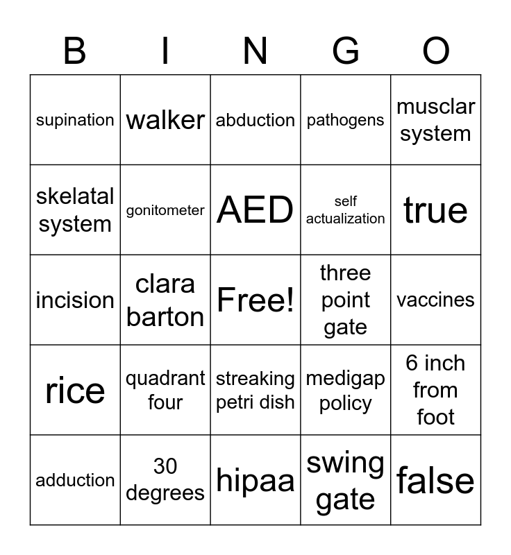 This bingo card has a free space and 29 words: adduction, amputation, clara barton, plantar flexion, supination, abduction, gonitometer, quadrant four, three point gate, 30 degrees, vaccines, false, hipaa, swing gate, true, medicaid, streaking petri dish, rice, musclar system, incision, medigap policy, saftey needs, self actualization, skelatal system, pathogens, walker, 6 inch from foot, AED and nervous system.