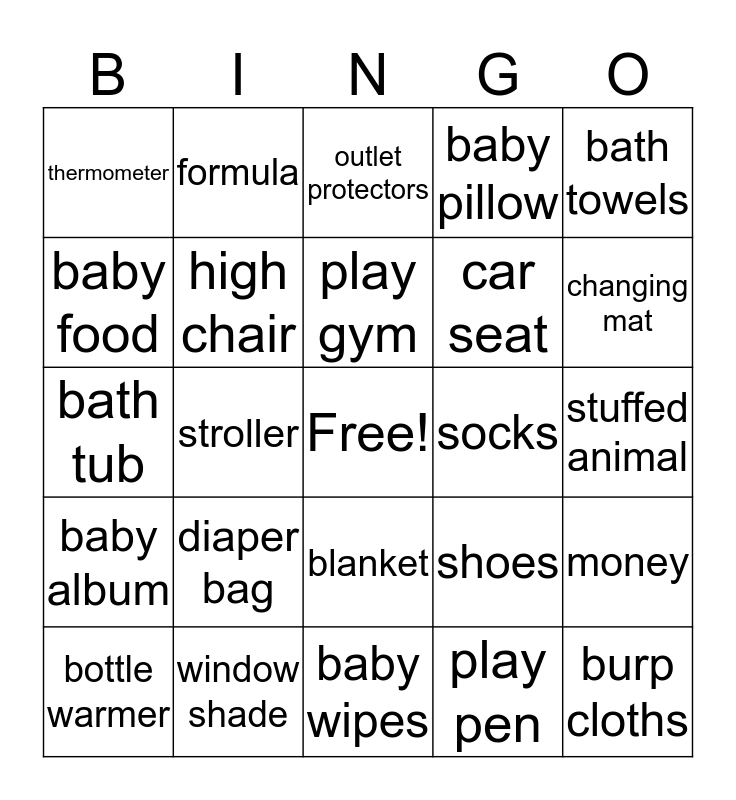 This bingo card has a free space and 24 words: diaper bag, window shade, play gym, bottle warmer, bath towels, thermometer, baby food, formula, socks, blanket, car seat, bath tub, shoes, money, high chair, play pen, stuffed animal, outlet protectors, changing mat, stroller, burp cloths, baby album, baby pillow and baby wipes.