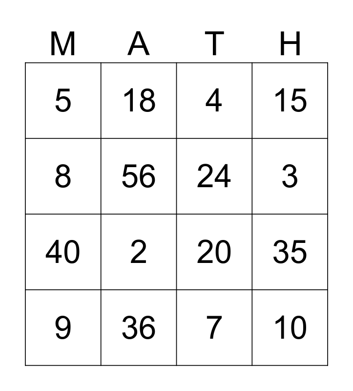 This bingo card has a free space and 15 words: 9, 10, 4, 5, 3, 8, 2, 7, 56, 40, 35, 15, 24, 18 and 36.