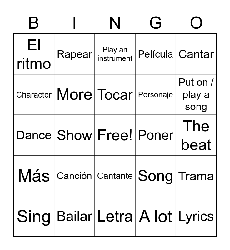 This bingo card has a free space and 34 words: Mucho, A lot, Me encanta, I love, Más, More, Cantar, Sing, Rapear, Rap, Tocar, Play an instrument, Escuchar, Listen, Poner, Put on / play a song, Bailar, Dance, Canción, Song, Cantante, Singer, El ritmo, The beat, Letra, Lyrics, Película, Movie, Personaje, Character, Serie, Show, Trama and Plot.