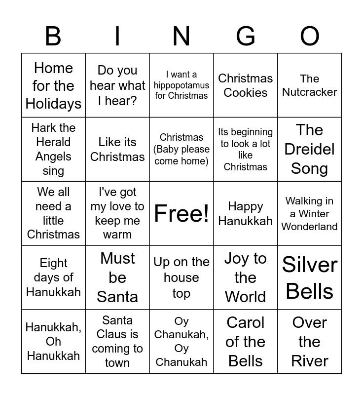 This bingo card has a free space and 29 words: Hanukkah, Oh Hanukkah, The Kwanzaa Song, I've got my love to keep me warm, Drummer Boy, Home for the Holidays, I want a hippopotamus for Christmas, Like its Christmas, Must be Santa, Happy Hanukkah, Santa Claus is coming to town, Walking in a Winter Wonderland, Over the River, Oy Chanukah, Oy Chanukah, Carol of the Bells, The Dreidel Song, Sleigh Ride, Up on the house top, Eight days of Hanukkah, The Nutcracker, We all need a little Christmas, Joy to the World, Do you hear what I hear, Its beginning to look a lot like Christmas, Hark the Herald Angels sing, Christmas Cookies, Do you hear what I hear?, Silver Bells, Christmas (Baby please come home) and Someday at Christmas.