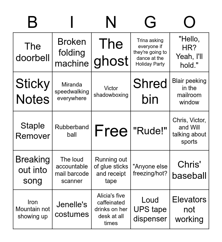 This bingo card has a free space and 24 words: Iron Mountain not showing up, The loud accountable mail barcode scanner, Victor shadowboxing, Loud UPS tape dispenser, "Hello, HR? Yeah, I'll hold.", The doorbell, Broken folding machine, The ghost, "Rude!", Chris, Victor, and Will talking about sports, Staple Remover, Miranda speedwalking everywhere, "Anyone else freezing/hot?, Chris' baseball, Sticky Notes, Jenelle's costumes, Alicia's five caffeinated drinks on her desk at all times, Trina asking everyone if they're going to dance at the Holiday Party, Blair peeking in the mailroom window, Breaking out into song, Rubberband ball, Running out of glue sticks and receipt tape, Shred bin and Elevators not working.