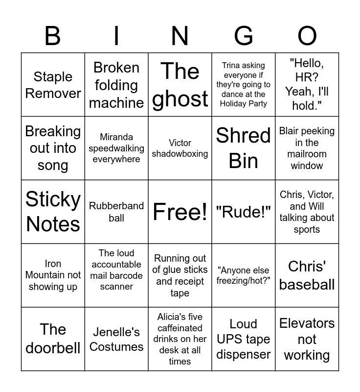 This bingo card has a free space and 24 words: The doorbell, The loud accountable mail barcode scanner, Victor shadowboxing, Loud UPS tape dispenser, "Hello, HR? Yeah, I'll hold.", Staple Remover, Broken folding machine, The ghost, "Rude!", Chris, Victor, and Will talking about sports, Sticky Notes, Miranda speedwalking everywhere, "Anyone else freezing/hot?", Chris' baseball, Breaking out into song, Jenelle's Costumes, Alicia's five caffeinated drinks on her desk at all times, Trina asking everyone if they're going to dance at the Holiday Party, Blair peeking in the mailroom window, Iron Mountain not showing up, Rubberband ball, Running out of glue sticks and receipt tape, Shred Bin and Elevators not working.