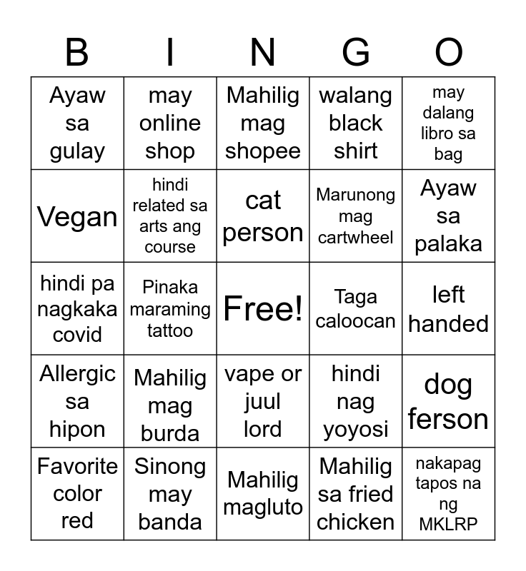 This bingo card has a free space and 24 words: Mahilig mag burda, Sinong may banda, cat person, Favorite color red, may dalang libro sa bag, Ayaw sa gulay, Vegan, may online shop, Taga caloocan, vape or juul lord, Marunong mag cartwheel, hindi pa nagkaka covid, hindi nag yoyosi, dog ferson, hindi related sa arts ang course, Mahilig sa fried chicken, left handed, Mahilig mag shopee, Ayaw sa palaka, Pinaka maraming tattoo, nakapag tapos na ng MKLRP, Allergic sa hipon, walang black shirt and Mahilig magluto.