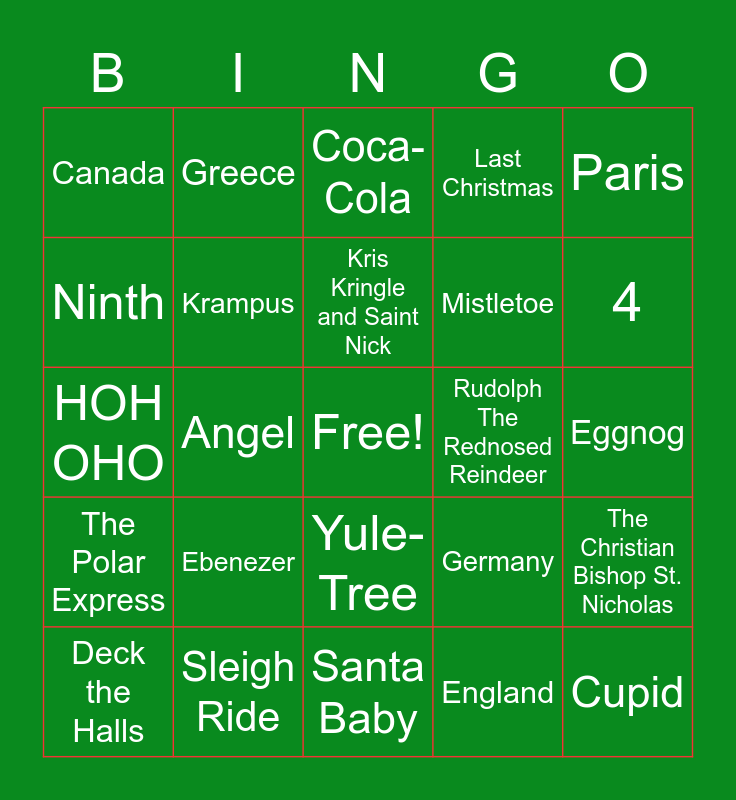 This bingo card has a free space and 42 words: Max, Kris Kringle and Saint Nick, Turkey, Ebenezer, England, The Christian Bishop St. Nicholas, Cupid, 364, Coca-Cola, Yule-Tree, Eggnog, 4, Angel, Paris, December 25, Germany, Xmas, HOH OHO, Yule,Bells,Libya,Jingle Bells, Greece, Ninth, Cookies and Milk, December, Canada, Tinsel, Cloves, Mistletoe, Mexico, Scott Calvin, Tiny tots, Home Alone, The Polar Express, Krampus, Santa Baby, Feliz Navidad, Deck the Halls, Sleigh Ride, Rudolph The Rednosed Reindeer, Let It Snow, Joy To The World, Last Christmas and It’s Beginning to Look a Lot Like Christmas.