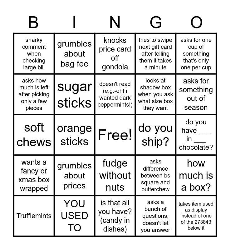 This bingo card has a free space and 29 words: Trufflemints, sugar free at candy counter, orange sticks, peppermint bark, snarky comment when checking large bill, knocks price card off gondola, sugar sticks, grumbles about prices, do you ship?, YOU USED TO, do you have ___ in ___ chocolate?, takes item used as display instead of one of the 273843 below it, is that all you have? (candy in dishes), asks a bunch of questions, doesn't let you answer, asks for something out of season, wants a box of 4 or 6, fudge without nuts, wants a fancy or xmas box wrapped, asks for one cup of something that's only one per cup, soft chews, asks difference between bs square and butterchew, molasses mint chews, looks at shadow box when you ask what size box they want, asks how much is left after picking only a few pieces, tries to swipe next gift card after telling them it takes a minute, grumbles about bag fee, how much is a box?, doesn't read (e.g.-oh! i wanted dark peppermints!) and what's a truffle?.