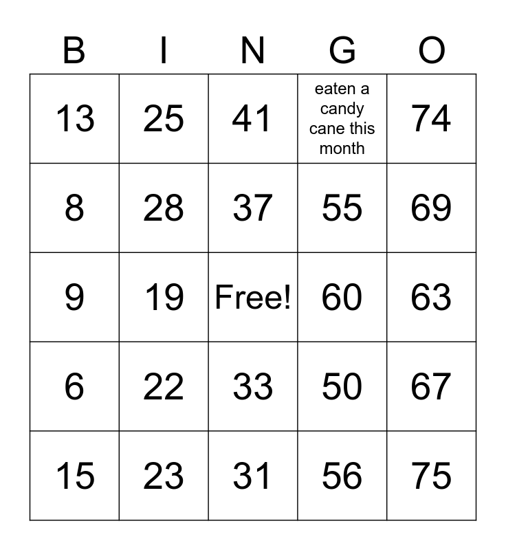 This bingo card has a free space and 87 words: 1, 16, 31, 46, 61, 2, 17, 32, 47, 62, 3, 18, 48, 63, 4, 19, 33, 49, 64, 5, 20, 34, 50, 65, 6, 21, 35, 51, 66, 7, 22, 36, 52, 67, 8, 23, 37, 53, 68, 9, 24, 38, 54, 69, 10, 25, 39, 55, 70, 11, 26, 40, 56, 71, 12, 27, 41, 57, 72, 13, 28, 42, 58, 73, 14, 29, 43, 59, 74, 15, 30, 44, 60, 75, You are currently wearing Christmas socks, You are currently wearing a holiday shirt, 45, Bought someone socks for Christmas, Sang a Christmas carol, Watched a Hallmark Christmas movie, Ready to ignore all school things, Drank Hot Chocolate this Weekend, Still mailing Christmas cards, eaten more than 3 tamales in December, you've baked Christmas treats, eaten a candy cane this month and you've made a Christmas craft.