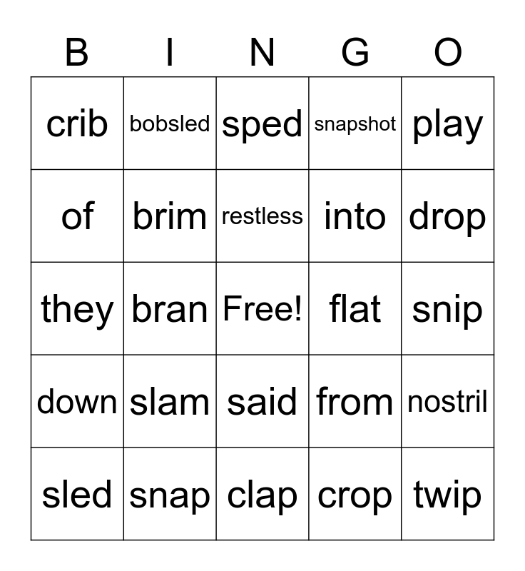 This bingo card has a free space and 29 words: sled, fled, bran, Fred, crib, sped, brim, slam, flat, snap, snip, twip, clap, crop, drop, snow, said, down, play, they, from, she, into, of, snapshot, bobsled, nostril, restless and bottom.