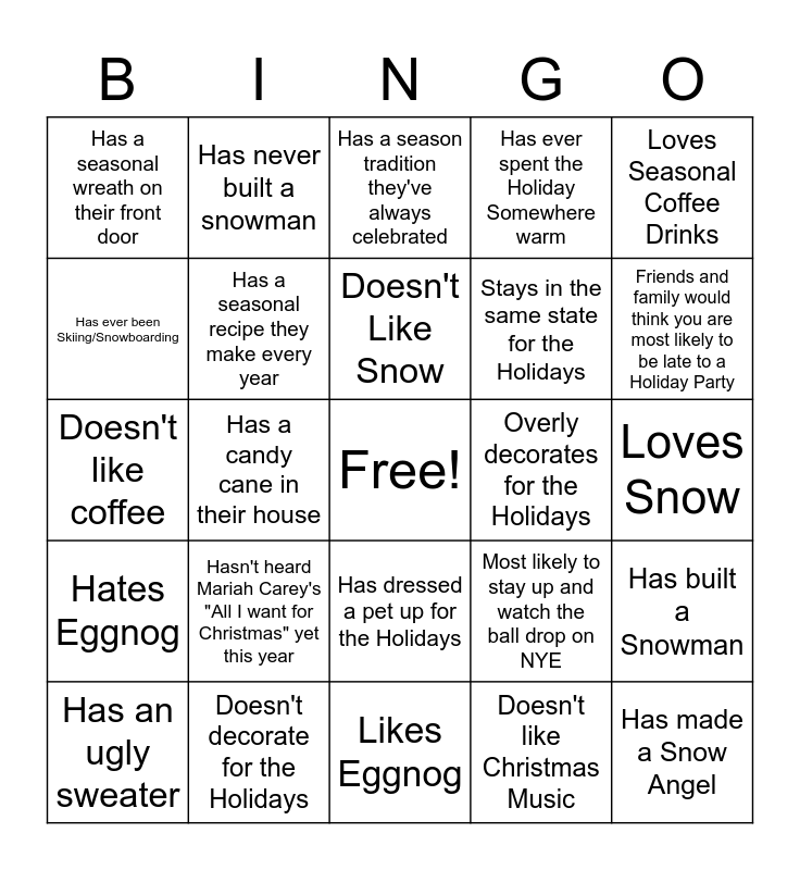 This bingo card has a free space and 29 words: Has an ugly sweater, Has hot cocoa in their kitchen, Has a candy cane in their house, Has hot cider in their kitchen, Has a seasonal wreath on their front door, Has a season tradition they've always celebrated, Has a seasonal recipe they make every year, Hasn't heard Mariah Carey's "All I want for Christmas" yet this year, Overly decorates for the Holidays, Doesn't decorate for the Holidays, Loves Snow, Has made a Snow Angel, Likes Eggnog, Doesn't like Christmas Music, Friends and family would think you are most likely to be late to a Holiday Party, Friends and family say you are most likely to be early to a Holiday party, Has dressed a pet up for the Holidays, Hates Eggnog, Loves Seasonal Coffee Drinks, Doesn't like coffee, Most likely to stay up and watch the ball drop on NYE, Travels to a different state for the Holidays, Stays in the same state for the Holidays, Has ever been Skiing/Snowboarding, Has ever spent the Holiday Somewhere warm, Has never built a snowman, Has built a Snowman, Doesn't Like Snow and Most Likely to fall asleep before Midnight on NYE.