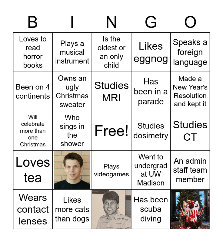 This bingo card has 6 images, a free space and 45 words: Plays a musical instrument, Birthday in December, Been on 4 continents, Travel more than 250 miles for the 2022 holidays, Owns an ugly Christmas sweater, Likes eggnog, An admin staff team member, Went to undergrad at UW Madison, A fifth-year student, Studies ultrasound, Studies MRI, Studies dosimetry, Is left-handed, Speaks a foreign language, Who sings in the shower, Has been scuba diving, Loves to read horror books, Has been in a parade, Loves birds or crocodiles, Loves spiders, Made a New Year's Resolution and kept it, Has 2 or more pets, Wears contact lenses, Is the oldest or an only child, Washer their own car, Cuts their own hair, Wearing something with Bucky on it, Is a dissertator, A first-year student, Likes more cats than dogs, Faculty member, Has ran a 10K, Brought their pet, Left the Midwest this summer, Studies CT, Loves tea, Loves sushi, Watched Grinch's movie this month, Built a gingerbread house, Skies or snowboards, Will celebrate more than one Christmas, Went to a conference in Hawaii, Is allergic to cats, Plays videogames and Loves coffee.