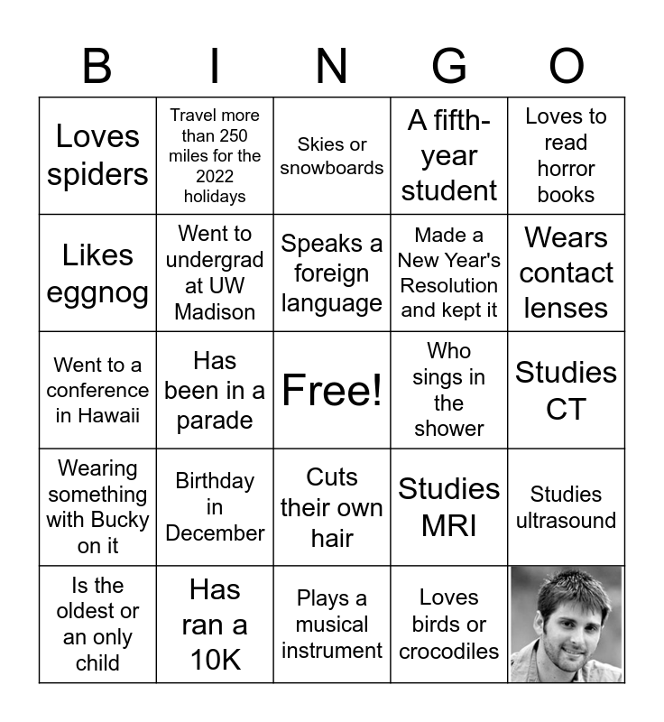 This bingo card has 3 images, a free space and 45 words: Plays a musical instrument, Birthday in December, Been on 4 continents, Travel more than 250 miles for the 2022 holidays, Owns an ugly Christmas sweater, Likes eggnog, An admin staff team member, Went to undergrad at UW Madison, A fifth-year student, Studies ultrasound, Studies MRI, Studies dosimetry, Is left-handed, Speaks a foreign language, Who sings in the shower, Has been scuba diving, Loves to read horror books, Has been in a parade, Loves birds or crocodiles, Loves spiders, Made a New Year's Resolution and kept it, Has 2 or more pets, Wears contact lenses, Is the oldest or an only child, Washer their own car, Cuts their own hair, Wearing something with Bucky on it, Is a dissertator, A first-year student, Likes more cats than dogs, Faculty member, Has ran a 10K, Brought their pet, Left the Midwest this summer, Studies CT, Loves tea, Loves sushi, Watched Grinch's movie this month, Built a gingerbread house, Skies or snowboards, Will celebrate more than one Christmas, Went to a conference in Hawaii, Is allergic to cats, Plays videogames and Loves coffee.