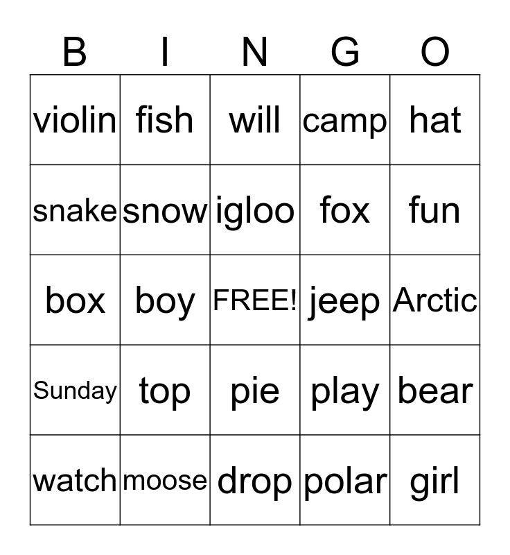 This bingo card has a free space and 24 words: top, moose, igloo, watch, hat, violin, snake, fish, jeep, pie, fox, box, play, bear, snow, polar, Arctic, will, fun, boy, girl, Sunday, camp and drop.