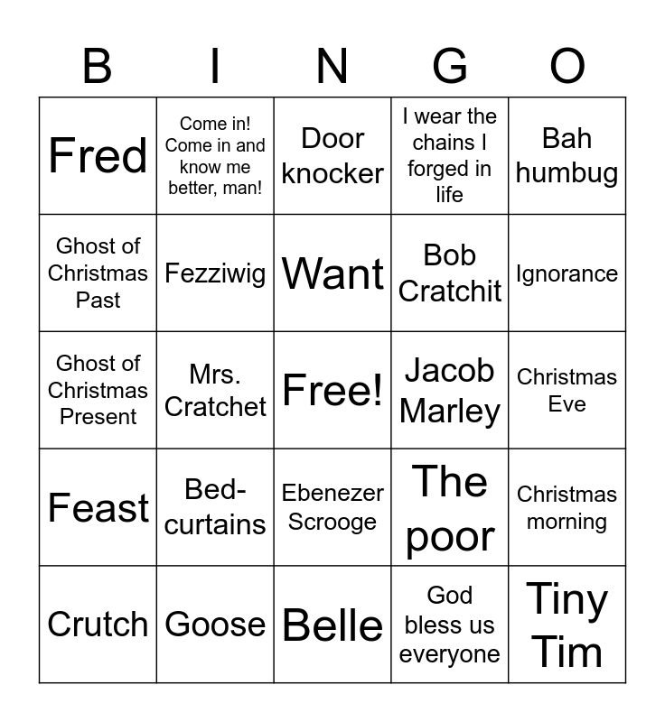 This bingo card has a free space and 26 words: Ebenezer Scrooge, God bless us everyone, Want, Goose, Bah humbug, Fred, Ghost of Christmas Past, Come in! Come in and know me better, man!, Christmas Eve, The poor, Bob Cratchit, Ghost of Christmas Present, Christmas morning, Crutch, Mrs. Cratchet, Ghost of Christmas Yet To Come, I wear the chains I forged in life, Feast, Door knocker, Tiny Tim, Ignorance, Belle, Jacob Marley, Bed-curtains, Fezziwig and Dead as a doornail.