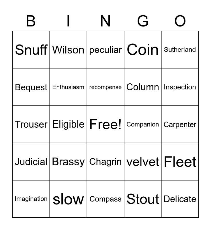 This bingo card has a free space and 34 words: Autumn, Stout, Partner, Glance, Judicial, Enthusiasm, Sutherland, Imagination, Wilson, Doubt, recompense, peculiar, Portly, Advertisement, Companion, Inspection, slow, Trouser, Brassy, velvet, Chagrin, Manual, Snuff, Carpenter, Compass, Delicate, Coin, Ignorotum, Column, Bequest, Vacancy, Eligible, Fleet and Spirits.