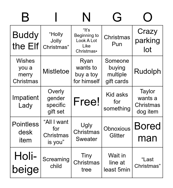 This bingo card has a free space and 24 words: “All I want for Christmas is you”, Screaming child, Ryan wants to buy a toy for himself, Holi-beige, Crazy parking lot, Buddy the Elf, Wishes you a merry Christmas, “Holly Jolly Christmas”, Kid asks for something, Ugly Christmas Sweater, Someone buying multiple gift cards, Impatient Lady, Obnoxious Glitter, Bored man, Mistletoe, Wait in line at least 5min, Taylor wants a Christmas dog item, “It’s Beginning to Look A Lot Like Christmas•, Rudolph, Overly gender specific gift set, “Last Christmas”, Pointless desk item, Christmas Pun and Tiny Christmas tree.