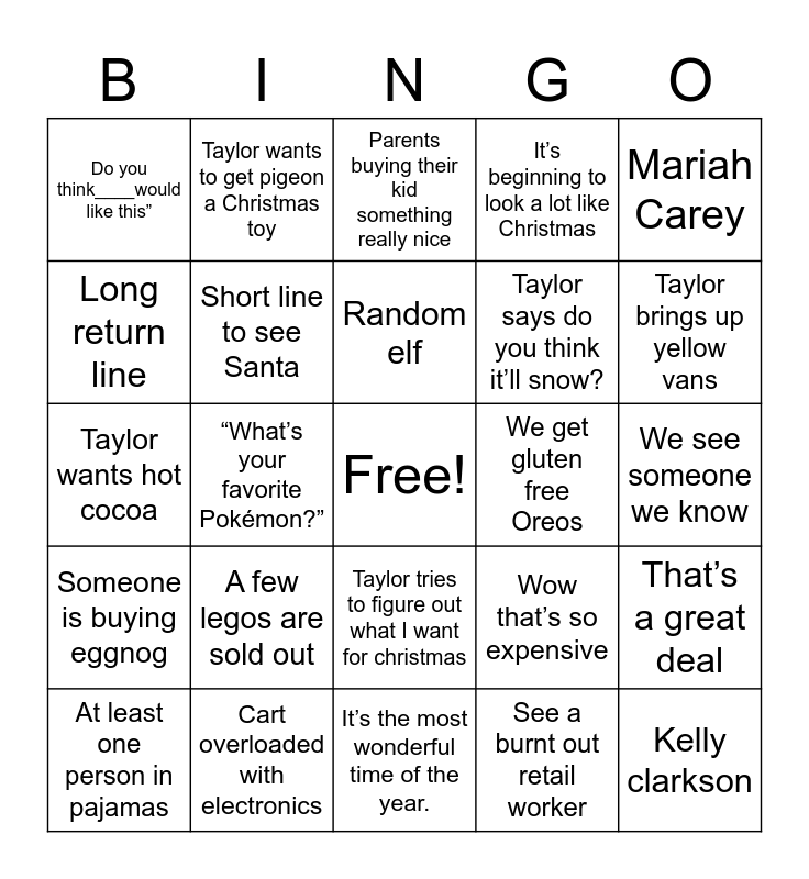This bingo card has a free space and 24 words: A few legos are sold out, Cart overloaded with electronics, Random elf, At least one person in pajamas, Mariah Carey, Do you think____would like this”, Long return line, Taylor wants to get pigeon a Christmas toy, We get gluten free Oreos, Taylor tries to figure out what I want for christmas, Taylor says do you think it’ll snow?, Taylor wants hot cocoa, Wow that’s so expensive, That’s a great deal, Short line to see Santa, See a burnt out retail worker, We see someone we know, Parents buying their kid something really nice, Taylor brings up yellow vans, “What’s your favorite Pokémon?”, Kelly clarkson, Someone is buying eggnog, It’s beginning to look a lot like Christmas and It’s the most wonderful time of the year..