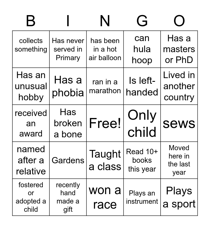 This bingo card has a free space and 29 words: same birth month as you, recently hand made a gift, has been in a hot air balloon, loves to clean, Has a masters or PhD, collects something, Has a phobia, ran in a marathon, Only child, Moved here in the last year, fostered or adopted a child, Has broken a bone, Plays an instrument, Plays a sport, received an award, Won a contest, won a race, Read 10+ books this year, Lived in another country, named after a relative, Gardens, owns a business, Is left-handed, sews, Has an unusual hobby, Has never served in Primary, Taught a class, can hula hoop and Has been skydiving.
