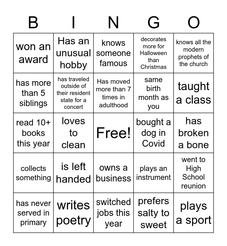 This bingo card has a free space and 29 words: has never served in primary, recently hand made a gift, loves to clean, embroiders, won an award, knows someone famous, has traveled outside of their resident state for a concert, is left handed, bought a dog in Covid, writes poetry, has broken a bone, plays a sport, switched jobs this year, prefers salty to sweet, taught a class, sews, owns a business, collects something, knows all the modern prophets of the church, read 10+ books this year, plays an instrument, speaks 3+ languages, same birth month as you, has more than 5 siblings, decorates more for Halloween than Christmas, Has an unusual hobby, went to High School reunion, Has moved more than 7 times in adulthood and has a secret talent.