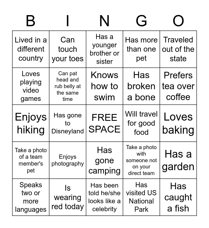 This bingo card has a free space and 24 words: Enjoys photography, Is wearing red today, Knows how to swim, Speaks two or more languages, Traveled out of the state, Lived in a different country, Loves playing video games, Can touch your toes, Will travel for good food, Has gone camping, Has broken a bone, Enjoys hiking, Take a photo with someone not on your direct team, Has a garden, Can pat head and rub belly at the same time, Has visited US National Park, Loves baking, Has a younger brother or sister, Prefers tea over coffee, Has gone to Disneyland, Has caught a fish, Take a photo of a team member's pet, Has more than one pet and Has been told he/she looks like a celebrity.