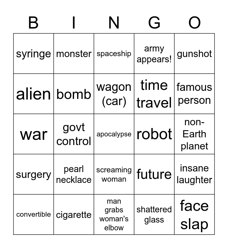 This bingo card has a free space and 24 words: pearl necklace, cigarette, wagon (car), convertible, gunshot, syringe, alien, monster, robot, screaming woman, time travel, war, future, insane laughter, bomb, shattered glass, non-Earth planet, spaceship, famous person, govt control, face slap, surgery, army appears! and man grabs woman's elbow.