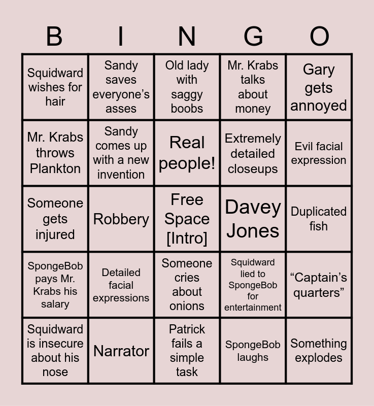This bingo card has a free space and 76 words: Continuity error, 4th wall broken, Old lady with saggy boobs, Defying the laws of underwater life, “I’m ready”, SpongeBob fails driving test, Plankton tries to steal the secret formula, Patrick comes out of nowhere, Sandy appearance, Mutilation, Unexpected coincidence, Clarinet playing, Real people!, Mr. Krabs throws Plankton, A fish dies, Robbery, Mrs. Puff blows up, Something explodes, Misdirection, Gary gets annoyed, Someone plays someone else’s ideas off as their own, Someone gets injured, Sandy comes up with a new invention, Sandy saves everyone’s asses, Mr. Krabs talks about money, Underpants make an appearance, SpongeBob sings, Squidward skips town, Karate, Patrick talks about food, Patrick gives bad advice, Time to ruin squid’s day, Jellyfishing, Squidward lied to SpongeBob for entertainment, Evil facial expression, Extremely detailed closeups, Screaming sound effect, Surfer fish makes an appearance, Duplicated fish, SpongeBob laughs, Mr. Krabs laughs, SpongeBob wears glasses, SpongeBob takes off his shoes, SpongeBob wears socks with his bathing suit, Bad puns, SpongeBob wears a wig or grows hair, Squidward is insecure about his nose, Squidward wishes for hair, Squilliam makes an appearance, Foghorn, Squidward doesn’t do his job, Someone cries about onions, SpongeBob expresses his love for his job, Squidward has an ounce of care for SpongeBob, SpongeBob snores, “My leg!”, Mr. Krabs personifies money, SpongeBob turns emo, Takes phrases literally, Patrick gets angry at SpongeBob, Detailed facial expressions, SpongeBob relatives, Overly happy about something random, Mr. Krabs doesn’t follow employment laws, References to seafood, Squidward complains about the Krusty Krab, Davey Jones, “The Flyin’ Dutchman!”, People of Bikini Bottom are rude, A character is in serious denial, “Captain’s quarters”, SpongeBob pays Mr. Krabs his salary, Narrator, Island ❤️, Patrick fails a simple task and Angry mob.