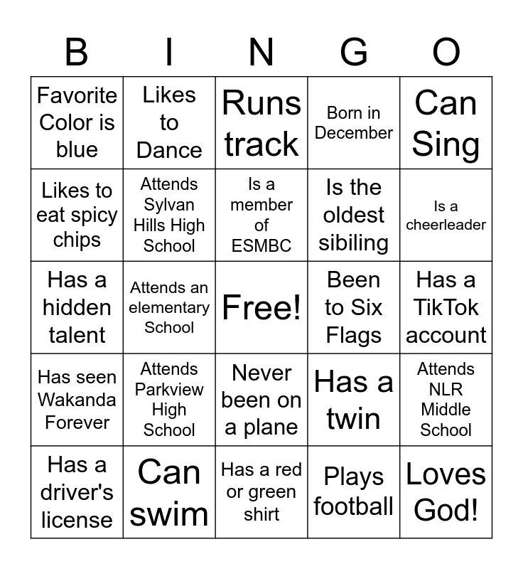 This bingo card has a free space and 24 words: Attends Parkview High School, Can swim, Is a member of ESMBC, Has a driver's license, Can Sing, Favorite Color is blue, Likes to eat spicy chips, Likes to Dance, Been to Six Flags, Never been on a plane, Is the oldest sibiling, Has a hidden talent, Has a twin, Attends NLR Middle School, Attends Sylvan Hills High School, Plays football, Has a TikTok account, Runs track, Is a cheerleader, Attends an elementary School, Loves God!, Has seen Wakanda Forever, Born in December and Has a red or green shirt.