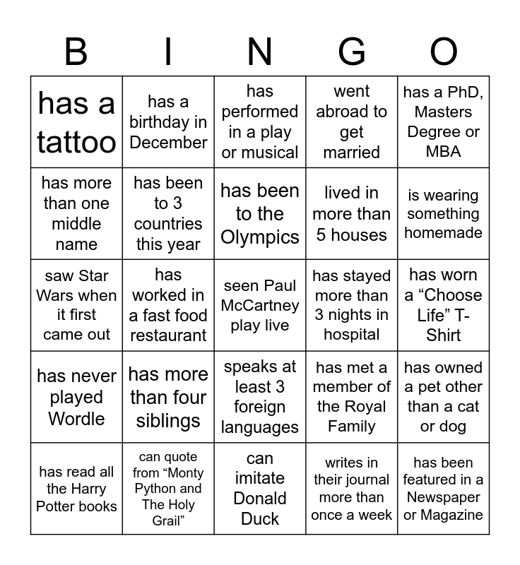 This bingo card has 37 words: Free!, is related to a famous person, has been on a blind date, has been to 3 countries this year, has owned a pet other than a cat or dog, has more than four siblings, has been to the Olympics, lived in a country not born in (& not Canada), has a PhD, Masters Degree or MBA, has been on TV or in a Movie, has worked in a fast food restaurant, went abroad to get married, seen Paul McCartney play live, has worn a “Choose Life” T-Shirt, has more than one middle name, has never played Wordle, has sung a solo in public (not at Church), has performed in a play or musical, speaks at least 3 foreign languages, has stayed more than 3 nights in hospital, has a tattoo, is wearing something homemade, has read all the Harry Potter books, can imitate Donald Duck, has won a competition, writes in their journal more than once a week, has a birthday in December, has played in a band, doesn’t know what Settlers of Catan is, has had their hair permed, has bought something on impulse after watching a sales demo, can quote from “Monty Python and The Holy Grail”, saw Star Wars when it first came out, has been featured in a Newspaper or Magazine, has met a member of the Royal Family, lived in more than 5 houses and has a YouTube Channel.