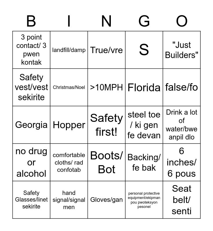 This bingo card has a free space and 25 words: comfortable cloths/ rad confotab, Gloves/gan, >10MPH, Safety Glasses/linet sekirite, "Just Builders", 3 point contact/ 3 pwen kontak, Safety vest/vest sekirite, landfill/damp, steel toe / ki gen fe devan, Boots/ Bot, Florida, Georgia, Backing/ fe bak, 6 inches/ 6 pous, Christmas/Noel, supervisor/manager, Drink a lot of water/bwe anpil dlo, True/vre, false/fo, Hopper, Seat belt/ senti, hand signal/signal men, no drug or alcohol, S and personal protective equipment/ekipman pou pwoteksyon pesonel.