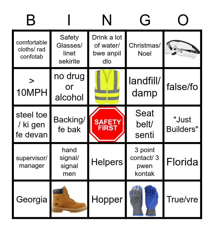 This bingo card has 4 images, a free space and 22 words: Helpers, comfortable cloths/ rad confotab, > 10MPH, Safety Glasses/ linet sekirite, "Just Builders", 3 point contact/ 3 pwen kontak, landfill/ damp, steel toe / ki gen fe devan, Florida, Georgia, Backing/ fe bak, 6 inches/ 6 pous, Christmas/ Noel, supervisor/ manager, Drink a lot of water/ bwe anpil dlo, True/vre, false/fo, Hopper, Seat belt/ senti, hand signal/ signal men, no drug or alcohol and personal protective equipment/ekipman pou pwoteksyon pesonel.