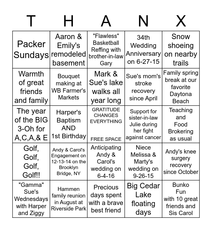 This bingo card has a free space and 24 words: Andy & Carol's Engagement on 12-13-14 on the Brooklyn Bridge, NY, Hammen family reunion in August at Riverside Park, Mark & Sue's lake walks all year long, "Gamma" Sue's Wednesdays with Harper and Ziggy, Snow shoeing on nearby trails, Packer Sundays, Warmth of great friends and family, Aaron & Emily's remodeled basement, Support for sister-in-law Julie during her fight against cancer, Anticipating Andy & Carol's wedding on 6-4-16, Sue's mom's stroke recovery since April, The year of the BIG 3-Oh for A,C,A,& E, Niece Melissa & Marty's wedding on 9-26-15, Andy's knee surgery recovery since October, Bouquet making at WB Farmer's Markets, Big Cedar Lake floating days, Teaching and Food Brokering as usual, "Flawless" Basketball Reffing with brother-in-law Gary, Family spring break at our favorite Daytona Beach, Harper's Baptism AND 1st Birthday, Bunko Fun with 10 great friends and Sis Carol, Golf, Golf, Golf, Golf!!, 34th Wedding Anniversary on 6-27-15 and Precious days spent with a brave best friend.