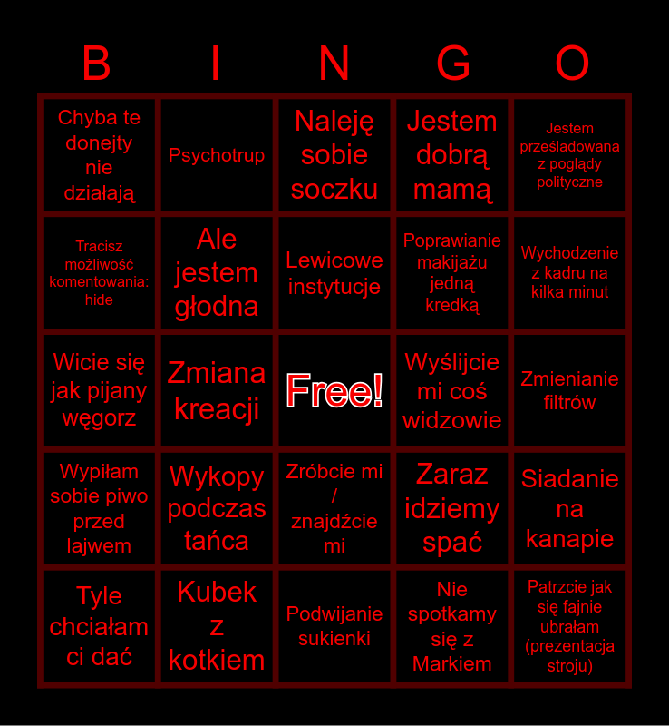 This bingo card has a free space and 24 words: Wykopy podczas tańca, Kubek z kotkiem, Lewicowe instytucje, Tyle chciałam ci dać, Jestem prześladowana z poglądy polityczne, Chyba te donejty nie działają, Tracisz możliwość komentowania: hide, Psychotrup, Wyślijcie mi coś widzowie, Zróbcie mi / znajdźcie mi, Poprawianie makijażu jedną kredką, Wicie się jak pijany węgorz, Zaraz idziemy spać, Siadanie na kanapie, Ale jestem głodna, Nie spotkamy się z Markiem, Zmienianie filtrów, Naleję sobie soczku, Wychodzenie z kadru na kilka minut, Zmiana kreacji, Patrzcie jak się fajnie ubrałam (prezentacja stroju), Wypiłam sobie piwo przed lajwem, Jestem dobrą mamą and Podwijanie sukienki.