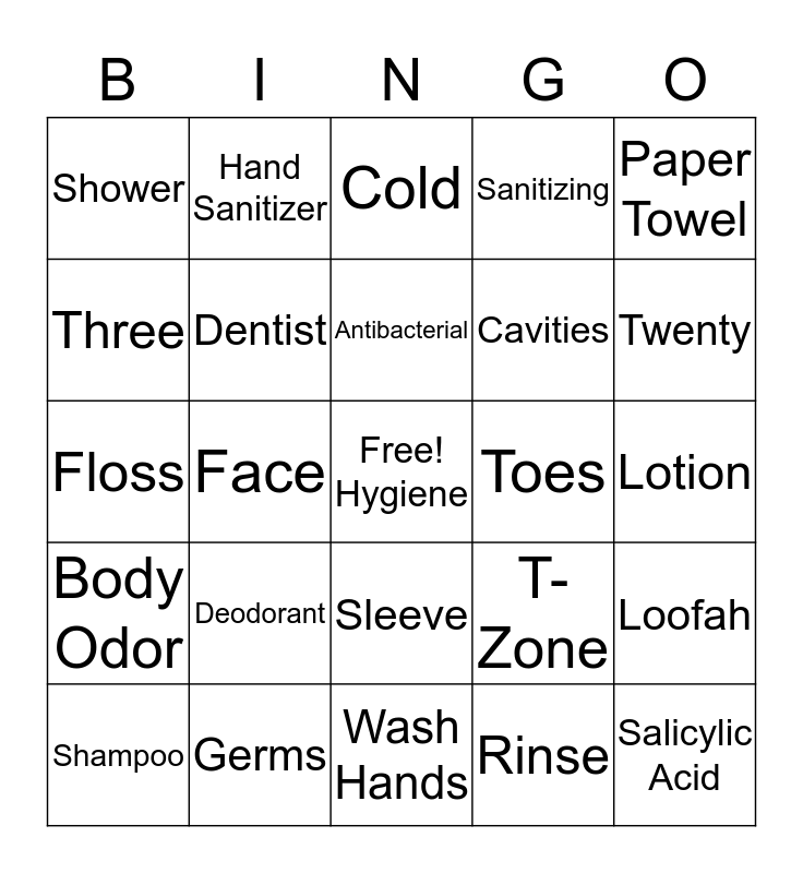 This bingo card has a free space and 24 words: Deodorant, Germs, Antibacterial, Shampoo, Paper Towel, Shower, Three, Hand Sanitizer, Toes, Sleeve, Cavities, Floss, T-Zone, Loofah, Dentist, Rinse, Lotion, Cold, Twenty, Face, Salicylic Acid, Body Odor, Sanitizing and Wash Hands.