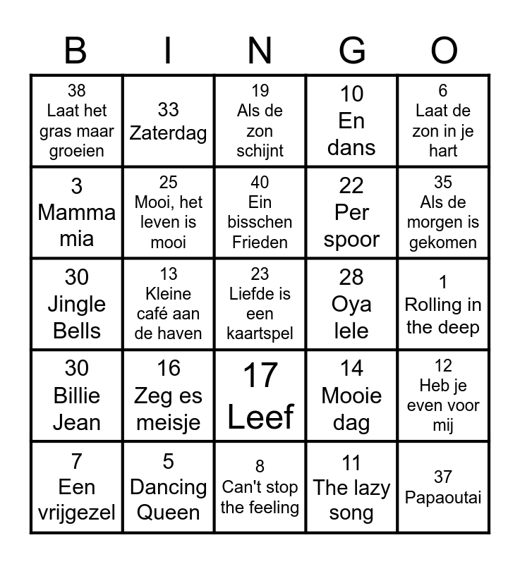 This bingo card has 40 words: 4 Gloria in excelsis deo, 30 Jingle Bells, 24 Bakse vol met stro, 25 Mooi, het leven is mooi, 5 Dancing Queen, 17 Leef, 40 Ein bisschen Frieden, 18 Sexy als ik dans, 6 Laat de zon in je hart, 30 Billie Jean, 13 Kleine café aan de haven, 10 En dans, 23 Liefde is een kaartspel, 1 Rolling in the deep, 28 Oya lele, 16 Zeg es meisje, 29 Sur ma route, 38 Laat het gras maar groeien, 2 Vida la vida, 19 Als de zon schijnt, 12 Heb je even voor mij, 11 The lazy song, 22 Per spoor, 3 Mamma mia, 36 Ik krijg een heel apart gevoel vanbinnen, 27 Les Champs Elysees, 31 Dromen zijn bedrog, 15 Duurt te lang, 37 Papaoutai, 20 't is weer voorbij die mooie zomer, 32 Shallow, 7 Een vrijgezel, 21 J'aime la vie, 14 Mooie dag, 35 Als de morgen is gekomen, 8 Can't stop the feeling, 34 Blauwe dag, 26 Boten Anna, 33 Zaterdag and 9 I am good.