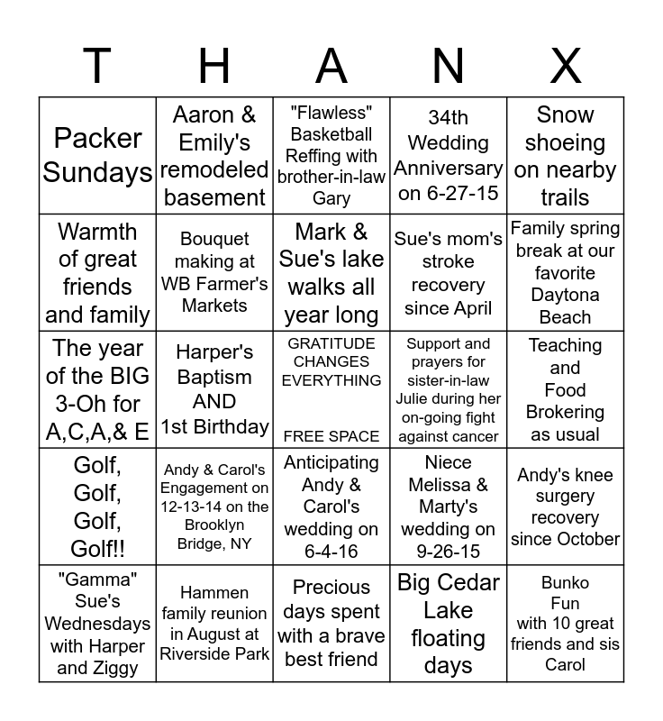 This bingo card has a free space and 24 words: Andy & Carol's Engagement on 12-13-14 on the Brooklyn Bridge, NY, Hammen family reunion in August at Riverside Park, Mark & Sue's lake walks all year long, "Gamma" Sue's Wednesdays with Harper and Ziggy, Snow shoeing on nearby trails, Packer Sundays, Warmth of great friends and family, Aaron & Emily's remodeled basement, Support and prayers for sister-in-law Julie during her on-going fight against cancer, Anticipating Andy & Carol's wedding on 6-4-16, Sue's mom's stroke recovery since April, The year of the BIG 3-Oh for A,C,A,& E, Niece Melissa & Marty's wedding on 9-26-15, Andy's knee surgery recovery since October, Bouquet making at WB Farmer's Markets, Big Cedar Lake floating days, Teaching and Food Brokering as usual, "Flawless" Basketball Reffing with brother-in-law Gary, Family spring break at our favorite Daytona Beach, Harper's Baptism AND 1st Birthday, Bunko Fun with 10 great friends and sis Carol, Golf, Golf, Golf, Golf!!, 34th Wedding Anniversary on 6-27-15 and Precious days spent with a brave best friend.
