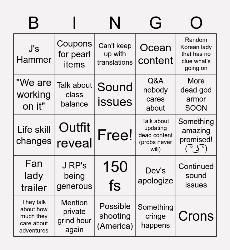 This bingo card has a free space and 24 words: J RP's being generous, Mention private grind hour again, Sound issues, They talk about how much they care about adventures, Random Korean lady that has no clue what's going on, J's Hammer, "We are working on it", Coupons for pearl items, Talk about updating dead content (probs never will), 150 fs, Q&A nobody cares about, Life skill changes, Dev's apologize, Continued sound issues, Talk about class balance, Something cringe happens, Something amazing promised! ( ͡° ͜ʖ ͡°), Can't keep up with translations, More dead god armor SOON, Outfit reveal, Crons, Fan lady trailer, Ocean content and Possible shooting (America).
