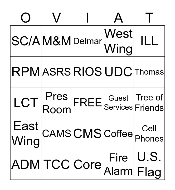 This bingo card has a free space and 24 words: CAMS, TCC, RIOS, ADM, ILL, SC/A, RPM, M&M, Guest Services, CMS, UDC, LCT, Coffee, Cell Phones, ASRS, Fire Alarm, Tree of Friends, Delmar, Thomas, Pres Room, U.S. Flag, East Wing, West Wing and Core.
