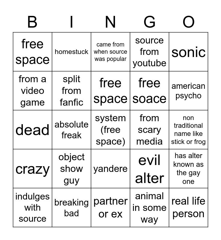 This bingo card has a free space and 24 words: object show guy, breaking bad, free space, indulges with source, sonic, free space, from a video game, homestuck, from scary media, yandere, free soace, dead, evil alter, has alter known as the gay one, split from fanfic, animal in some way, non traditional name like stick or frog, came from when source was popular, american psycho, absolute freak, real life person, crazy, source from youtube and partner or ex.