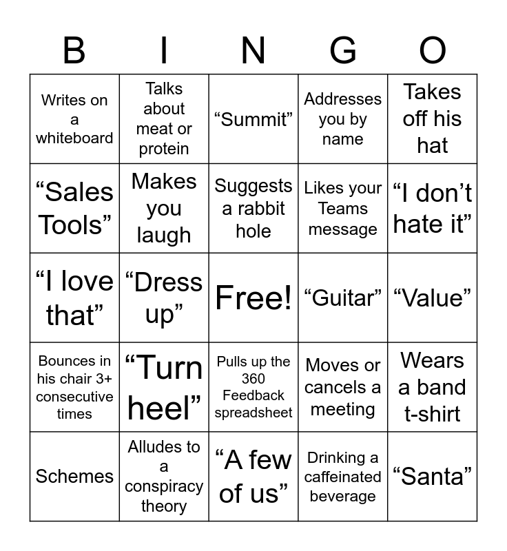 This bingo card has a free space and 24 words: “Turn heel”, Alludes to a conspiracy theory, Suggests a rabbit hole, Schemes, Takes off his hat, Writes on a whiteboard, “Sales Tools”, Talks about meat or protein, “Guitar”, Pulls up the 360 Feedback spreadsheet, Likes your Teams message, “I love that”, Moves or cancels a meeting, Wears a band t-shirt, Makes you laugh, Drinking a caffeinated beverage, “Value”, “Summit”, “I don’t hate it”, “Dress up”, “Santa”, Bounces in his chair 3+ consecutive times, Addresses you by name and “A few of us”.