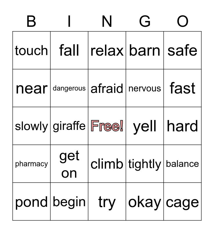 This bingo card has a free space and 24 words: pond, get on, afraid, okay, safe, touch, fall, relax, yell, hard, slowly, dangerous, tightly, balance, near, begin, try, barn, fast, pharmacy, giraffe, climb, nervous and cage.