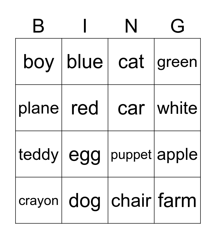 This bingo card has 29 words: Free!, Annie, apple, bat, boy, cat, car, duck, dog, desk, chair, crayon, pencil, notebook, egg, elephant, fish, farm, plane, puppet, robot, balloon, teddy, red, green, blue, black, white and yellow.