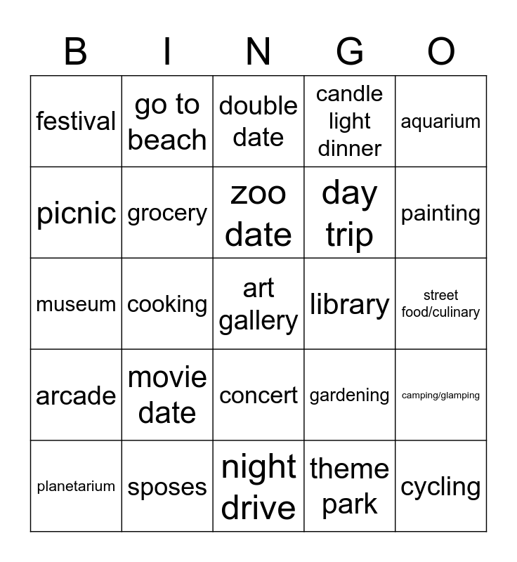 This bingo card has a free space and 24 words: movie date, sposes, zoo date, planetarium, aquarium, festival, picnic, go to beach, library, concert, day trip, museum, gardening, camping/glamping, grocery, theme park, street food/culinary, double date, painting, cooking, cycling, arcade, candle light dinner and night drive.