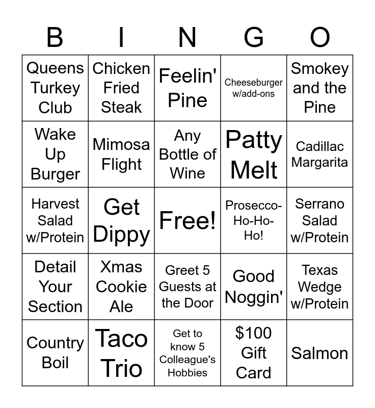 This bingo card has a free space and 29 words: Country Boil, Peach Cobbler, Get Dippy, $25 Gift Card, Queens Turkey Club, Feelin' Pine, Mimosa Flight, Xmas Cookie Ale, Prosecco-Ho-Ho-Ho!, Taco Trio, Serrano Salad w/Protein, Salmon, Get to know 5 Colleague's Hobbies, $100 Gift Card, Cadillac Margarita, Any Whiskey Cocktail with Buffalo Trace, Greet 5 Guests at the Door, Detail Your Section, Smokey and the Pine, Harvest Salad w/Protein, Good Noggin', Burg B Q, Patty Melt, Wake Up Burger, Cheeseburger w/add-ons, Chicken Fried Steak, Texas Wedge w/Protein, Any Bottle of Wine and Any Hot Drink.