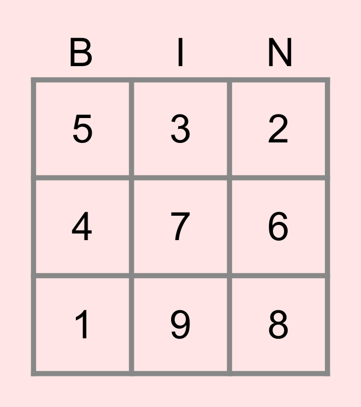 This bingo card has 9 words: 1, 2, 3, 4, 5, 6, 7, 8 and 9.