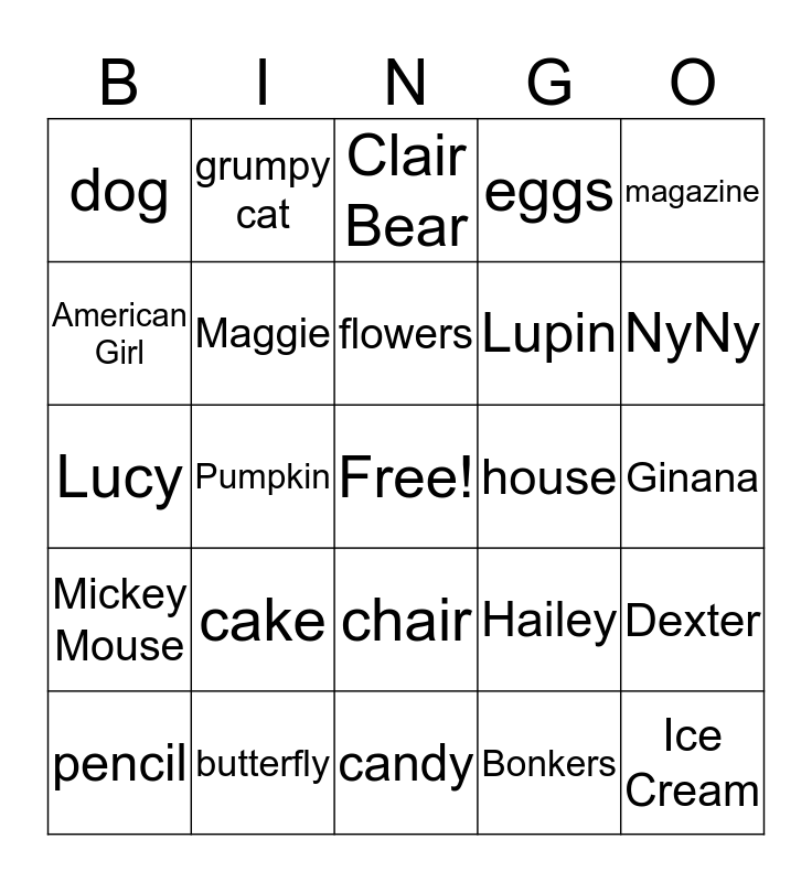 This bingo card has a free space and 24 words: cake, butterfly, flowers, pencil, magazine, dog, American Girl, grumpy cat, house, chair, Lupin, Lucy, Hailey, Dexter, Maggie, Bonkers, Ginana, Clair Bear, NyNy, Pumpkin, Ice Cream, Mickey Mouse, eggs and candy.