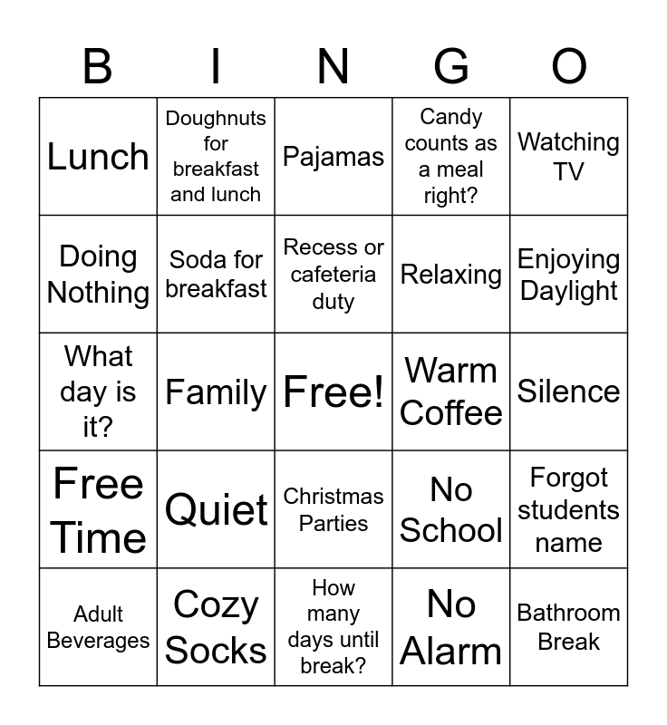 This bingo card has a free space and 29 words: Adult Beverages, Socializing, Family, Shopping, Lunch, Pajamas, Soda for breakfast, Quiet, Warm Coffee, Cozy Socks, Silence, Bathroom Break, How many days until break?, No Alarm, Enjoying Daylight, Sleeping In, Christmas Parties, Free Time, Watching TV, What day is it?, No School, Vacation, Relaxing, Doing Nothing, Candy counts as a meal right?, Doughnuts for breakfast and lunch, Forgot students name, Recess or cafeteria duty and Cried.
