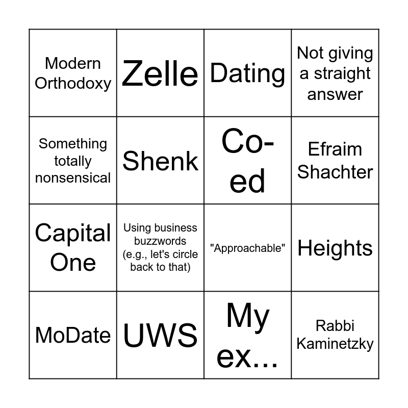 This bingo card has 16 words: UWS, Heights, Dating, Modern Orthodoxy, Capital One, Zelle, "Approachable", My ex..., Something totally nonsensical, Shenk, MoDate, Not giving a straight answer, Using business buzzwords (e.g., let's circle back to that), Efraim Shachter, Co-ed and Rabbi Kaminetzky.