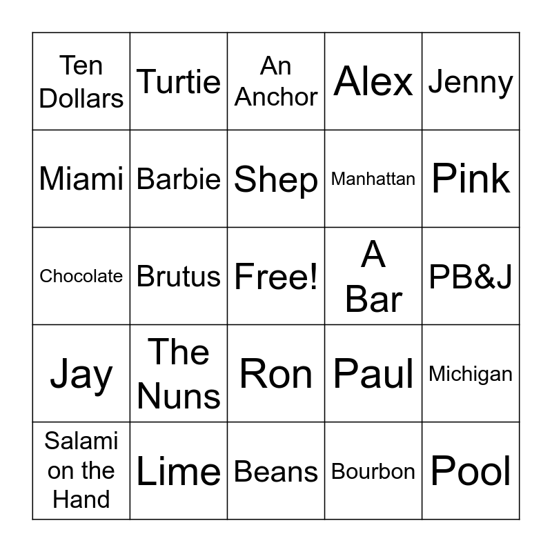This bingo card has a free space and 24 words: The Nuns, Lime, Shep, Salami on the Hand, Jenny, Ten Dollars, Miami, Turtie, A Bar, Ron, Manhattan, Chocolate, Paul, Michigan, Barbie, Bourbon, PB&J, An Anchor, Pink, Brutus, Pool, Jay, Alex and Beans.
