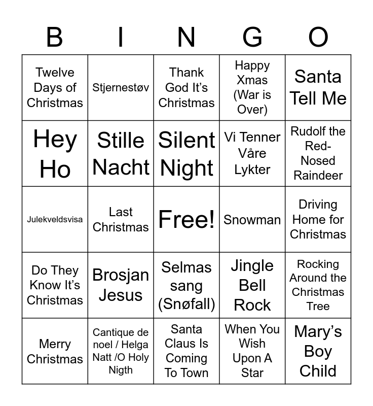 This bingo card has a free space and 26 words: Selmas sang (Snøfall), When You Wish Upon A Star, Silent Night, Cantique de noel / Helga Natt /O Holy Nigth, Santa Tell Me, Twelve Days of Christmas, Hey Ho, Stjernestøv, Driving Home for Christmas, Jingle Bell Rock, Vi Tenner Våre Lykter, Julekveldsvisa, Rocking Around the Christmas Tree, Merry Christmas, Last Christmas, White Christmas, Happy Xmas (War is Over), Do They Know It’s Christmas, Thank God It’s Christmas, Mary’s Boy Child, Rudolf the Red-Nosed Raindeer, Santa Claus Is Coming To Town, Snowman, Brosjan Jesus, Stille Nacht and Christmas Ligths.