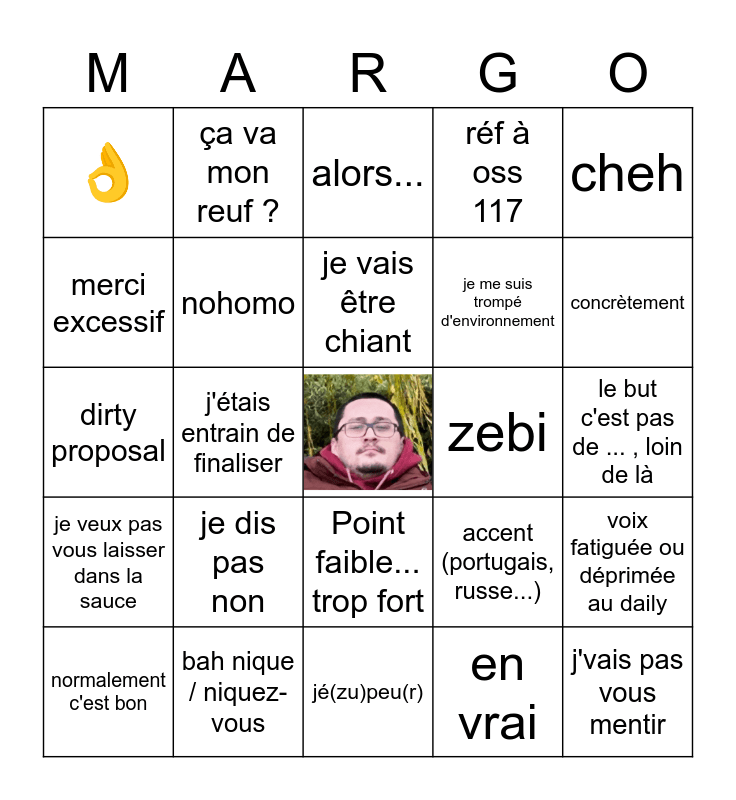 This bingo card has a free space and 36 words: mine de rien, désolé / excusez-moi, c'est presque fini, je me suis trompé d'environnement, j'vais pas vous mentir, normalement c'est bon, je dis pas non, c'est pas folichon, réf à oss 117, c'est tricky, je veux pas vous laisser dans la sauce, j'étais entrain de finaliser, je me permet, le but c'est pas de ... , loin de là, dirty proposal, ça va mon reuf ?, jé(zu)peu(r), zebi, concrètement, 👌, bah nique / niquez-vous, je vais être chiant, accent (portugais, russe...), j'aime ce, je suis colère, nohomo, alors..., hum (rire aigu), cheh, merci excessif, Big brain, Point faible... trop fort, en vrai, voix fatiguée ou déprimée au daily, Je vais essayer (au lieu de je vais le faire) and hors-pro.